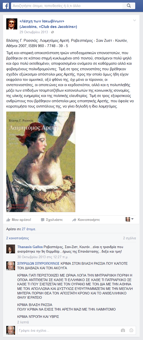 "FACEBOOK" - ΣΠΥΡΙΔΩΝ ΣΠΥΡΟΠΟΥΛΟΣ - ΣΧΟΛΙΟ ΣΤΟ "«Λέσχη των Ιακωβίνων» (Jacobins, «Club des Jacobins»)": "...ΚΡΙΜΑ ΒΛΑΣΗ ΡΑΣΣΙΑ - ΠΟΛΥ ΚΡΙΜΑ ΝΑ ΕΧΕΙΣ ΤΗΝ ΑΡΕΤΗ ΜΑΖΙ ΜΕ ΤΗΝ ΛΑΙΜΗΤΟΜΟ - ΚΡΙΜΑ ΝΤΡΟΠΗ ΚΑΙ ΥΒΡΙΣ..."
